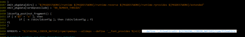 Adding ” –define ‘_fileattrsdir ${STAGING__LIB_DIR_NATIVE}/rpm/fileattrs'” in poky/meta/classes/package.bbclass, right where the rpmdeps command is.